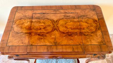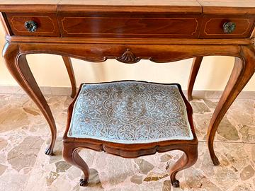 Mobile in noce, intarsiato, completamete restaurato, con porta gioielli e due cassetti laterali, specchio sulla ribaltina.