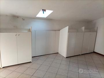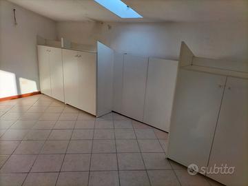 Mobile in pendenza per mansarda, composto da due elementi con ripiani, elemento centrale con porta per accesso parte posteriore, due elementi con appendi abiti.
