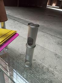 Mobile moderno in acciaio e vetro con 3 ripiani. Facilmente smontabile, dotato di smussi su un lato per posizionamento negli angoli delle stanze. Tubo centrale con forature passacavi utilizzabile anche come porta TV. Dimensioni 120x40 altezza 50cm.