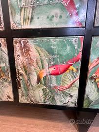 🎨 Frontali Decorati a Tema Naturale: Le ante sono composte da 16 riquadri decorativi munite di chiavi , ognuno con illustrazioni originali di uccelli tropicali e dettagli grafici su fondo verde acqua, che donano freschezza e un forte impatto visivo.
