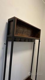 Design multifunzionale 3 in 1, che si basa su una struttura in metallo con finitura nera, presenta appendiabiti, panca d'ingresso, scarpiera e ripiano superiore per una maggiore organizzazione.