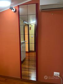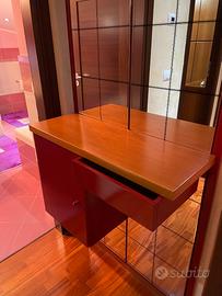 Mobile da ingresso con struttura bordeaux e piano in legno, completo di specchi componibili a moduli. Gli specchi possono essere montati in diverse configurazioni in base allo spazio disponibile. Il mobile dispone di un cassetto e un’anta contenitore. Design moderno ed elegante, ideale per ingresso o corridoio. In buone condizioni generali.