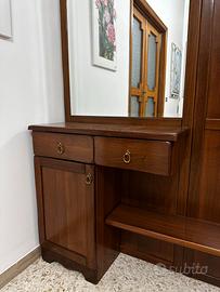 Mobile da ingresso in legno, composto da specchio, cassetti, vano contenitore, panca e appendiabiti. Stile classico, struttura solida e ben conservata. Ideale per ingresso o corridoio.