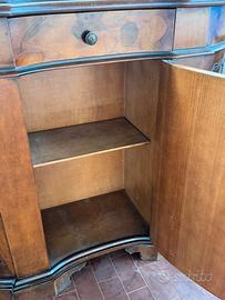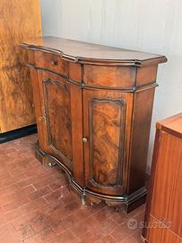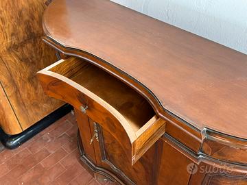 Mobile da ingresso credenza d'epoca in stile in legno noce. caratterizzata da un frontale leggermente bombato. II mobile presenta due ante laterali con pomelli in metallo e un'anta centrale con serratura e maniglia in ottone, sormontate da un cassetto superiore. Il piano sagomato e la base modanata con piedi scolpiti valorizzano la struttura, mentre la finitura calda mette in risalto la venatura naturale del legno. Un pezzo di gusto classico, ideale per ambienti raffinati e arredamenti tradizionali. Misure: lunghezza 110 cm x altezza 88 cm x profondità 35 cm