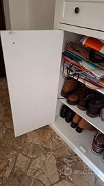 Consolle in legno placcato bianco con pomelli color bronzo. Pezzo di modernariato acquistato 2 anni fa. Molto comodo e spazioso anche da utilizzare come svuotatasche grazie al cassetto e per tenere in ordine le scarpe di uso quotidiano. Misure: altezza 104 cm, larghezza del piano 88 cm, larghezza del corpo 81 cm, spessore 40 cm.