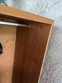 Mobile appendigiacche o armadio a vista in legno massiccio d’abete tinta noce prodotto di falegnameria. Con appendini a vista e barra portabiti laterale. 130 cm larghezza, 170 cm altezza 50 cm profondità