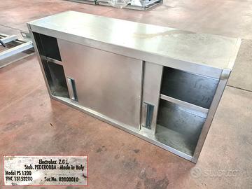 mobile inox sospeso usato, si tratta di un pensile in acciaio inossidabile per cucine e ambienti alimentari dotato di un ripiano interno e ante scorrevoli. di marca Electrolux mod. PS 1200. dimensioni: 120X38cm h60cm, ripiano 123X30cm