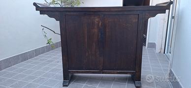 Mobile in legno, decorato in stile orientale. 2 cassetti e a 2 ripiani, con chiusura a 2 ante. Dimensioni p 35, l 135, h 85.