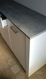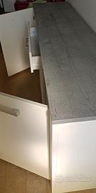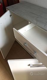 Mobile laminato bianco con ripiano simil - legno grigio. Un cassetto, tre ante e ripiani. Cm. 176 x43, h.82 cm.