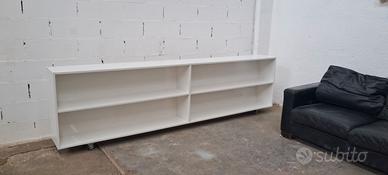 Il mobile misura 285cm × 81cm × 31cm ed è laminato lucido bianco. Si presenta in buone condizioni, è stato tenuto in uno spazio espositivo come appoggio. Ha le ruote con il blocco, comodo da spostare