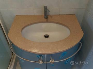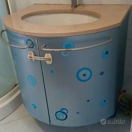 Mobile bagno sospeso curvo con 2 ante colore azzurro metallizzato completo di lavabo (lavandino) in ceramica.