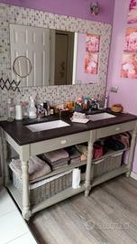 Mobile bagno stile provenzale, compreso di due lavabi, cestini in vimini con piano marmo da fare lucidare.