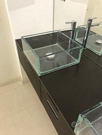 Mobile lavabo di pregio in legno e doppio lavabo in appoggio in vetro completo di miscelatori monocomando Gessi.