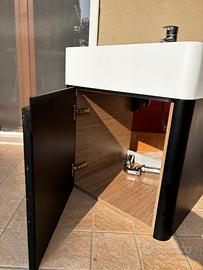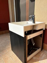 Mobile lavabo sospeso, in resina bianco, noce scuro, con rubinetto e billetta Grohe.