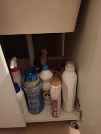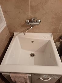 Mobile piu lavandino, attualmente in uso in zona lavanderia. Le misure sono riportate in foto. La vasca del rubinetto è in ceramica, molto capiente e pratica da pulire. Sia la vasca lavandino che il mobiletto sono colore bianco. Le ante sotto il lavandino consentono di riporre detersivi, spugne, asciugamani,... È disponibile anche una superficie in legno per il lavaggio a mano.