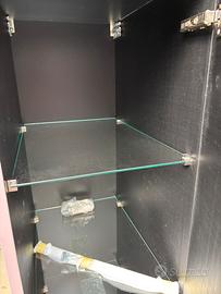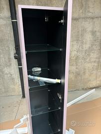 Colore laccato opaco glicine, tre ripiani interni in vetro, anta con apertura a destra e maniglia cromata.