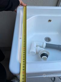 Mobile lavatoio in colore bianco, completo di vasca in resina e rubinetto miscelatore cromato con canna alta. Usato poco. Ritiro a carico dell’acquirente a Maerne di Martellago.