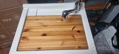 Include una vasca profonda e un'asse in legno per il lavaggio a mano. Struttura con ante frontali per contenere detersivi e accessori.