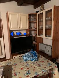 il mobile è realizzato in legno di pino in due colori con vetrinetta. dall'immagine non si vedono chiaramente due grandi cassettoni con chiusura scorrevole sotto la TV che non è compresa. il mobile è smontato, la consegna è a carico dell'acquirente.