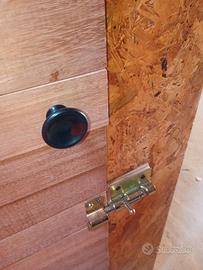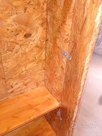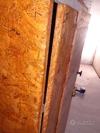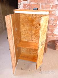 Ottime condizioni come da foto. Altezza 140 cm. Larghezza 65 cm. Realizzato in pannelli di OSB (Oriented Strand Board), scelti per la loro robustezza e l'aspetto grezzo. Trattato com impregnante all'acqua color Frassino. Anta sinistra realizzata con cornice esterna in OSB e inserto centrale composto da listelli di parquet grezzi, disposti orizzontalmente, che aggiungono un tocco di legno più nobile e rifinito. Anta destra più stretta con pannello Osb. Il mobile è dotato di un catenaccio a scorrimento metallico esterno e di un pomello nero centrale per l'apertura. Funzionale e solido, ideale per un laboratorio, un garage o un ambiente rustico con mattoni a vista. Ritiro a mano zona Livorno sud.