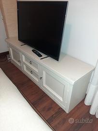 mobile basso con due cassetti centrali e due ante laterali. Dimensioni: lunghezza 154 cm, profondità 38 cm, altezza 48 cm. Colorato in avorio