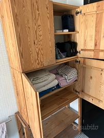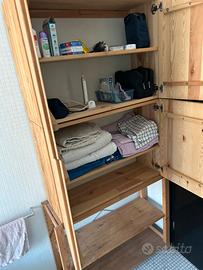 Mobile funzionale in legno massiccio di pino (IKEA), caratterizzato da un'estetica naturale e modulare. È una soluzione versatile che si adatta bene sia a un bagno che a una cantina o lavanderia. * Materiale: Realizzato in pino non trattato. Le venature del legno sono molto evidenti, il che conferisce un aspetto rustico e caldo. * Struttura Modulare: Il mobile è composto da una struttura a scaletta laterale con fori pre-trapanati, che permettono di regolare l'altezza dei ripiani e dei pensili con estrema facilità. * Dimensioni: 190 cm (altezza) x 80 cm (larghezza) x30 cm (profondità). Il mobile è diviso verticalmente in due sezioni principali: 1. Parte Superiore: Armadietti Chiusi * Dispone di quattro ante piene in legno che nascondono il contenuto, garantendo un aspetto ordinato. * All'interno, lo spazio è diviso da ripiani dove trovano posto prodotti per l'igiene, medicinali, piccoli contenitori e trousse. * Le ante utilizzano cerniere a scatto standard (tipo cucina), che permettono un'apertura ampia. 2. Parte Centrale: Vano a Giorno * Una sezione lasciata aperta o parzialmente coperta dalle ante per riporre la biancheria (asciugamani piegati, teli) e oggetti di uso frequente come lo spazzolino elettrico. 3. Parte Inferiore: Scaffalatura Aperta * La base è costituita da due ampi ripiani a vista. Questa zona è ideale per oggetti più ingombranti, ceste per i panni sporchi o, se usato in cantina, per cassette e attrezzi. È attualmente usato in un bagno, ma la sua robustezza lo rende perfetto anche per una cantina. La struttura poggia su quattro montanti verticali. Il legno naturale può essere facilmente personalizzato. È un mobile pratico, solido e senza fronzoli. Il suo punto di forza è la capacità di combinare contenitori chiusi (per il "disordine" visivo) e ripiani aperti (per la praticità), mantenendo un ingombro a terra contenuto grazie allo sviluppo in verticale.