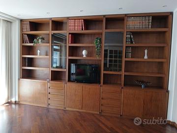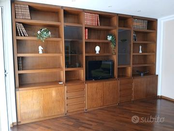 Mobile in legno a parete realizzato su misura parte libera a giorno con ripiani e parte sottostante chiusa a cassetti e sportelli misure larghezza mt.4,35 altezza mt.2,70