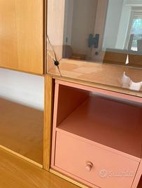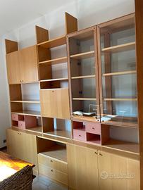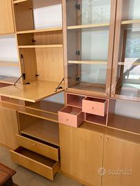 6 ante, due cassetti (+ 2 piccole cassettiere removibili), un'anta ribaltabile, scaffali vari e due ante in vetro.