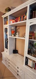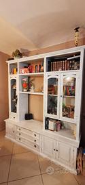 Vendo mobile da salotto con vetrina/libreria in legno, con eventuale spazio per tv, ridecorato a mano in colore meringa shabby. Il mobile è in ottime condizioni di manutenzione. Le misure sono 220 cm di larghezza, 240 cm di altezza e 56 cm di profondità.