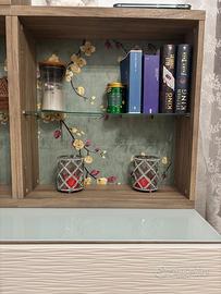 Vendo mobile contenitore con libreria Il mobile composto da una base che misura L180xH40 cm con tre vani contenitori.La libreria è composta da sei moduli con rispettiva mensola in vetro e ciascuno misura L60xH 65 cm