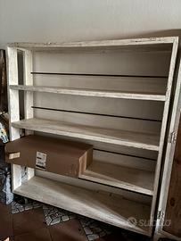 Mobile libreria in legno massiccio sbiancato e ruote in ferro. Larghezza 150 cm, altezza 173 cm. Profondità ripiani cm 35,5, altezza tra ripiani cm 38. Mobile usato in ottime condizioni. Consegna solo nel territorio di Parova e limitrofi.