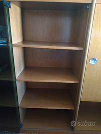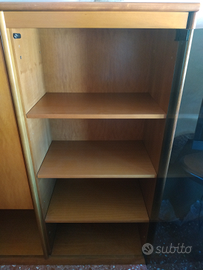 Mobile degli anni 70, composto da vano libreria, 2 vani vetrinetta con tre scaffali all'interno, un armadietto con sportello in legno e uno scaffale all'interno. Al momento il mobile si trova in un locale condominiale al settimo piano con ascensore ED È COMPLETAMENTE SMONTATO! È possibile visionarlo di persona per accertarsi dell'integrità e del buono stato del mobile. Misure: L 262 x P 42 x H 144 cm.