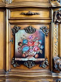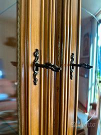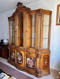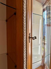 Elegante mobile a parete in stile Mid-Century Modern (anni '60). Un pezzo di design funzionale e di grande impatto estetico, ideale per salotti, studi o ingressi. Caratteristiche principali: Parte superiore: Scaffalatura a giorno con pannello superiore ("cielino") dotato di illuminazione integrata, perfetto per mettere in risalto libri o oggetti d'arte. Parte inferiore: Base contenitiva spaziosa composta da una cassettiera (3 cassetti con maniglie integrate) e un vano con anta battente e ripiano interno. Materiale: Pregiato legno impiallacciato dalla tonalità calda, tipica del design italiano dell'epoca. Il mobile è in buone condizioni vintage, con leggeri segni del tempo che ne sottolineano il carattere. L'impianto elettrico della luce è presente (da testare). Disponibile anche secondo mobile coordinato con ribalta (vedi altri annunci).