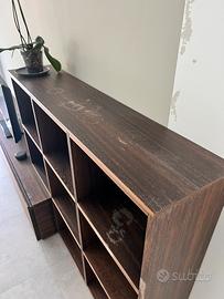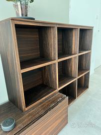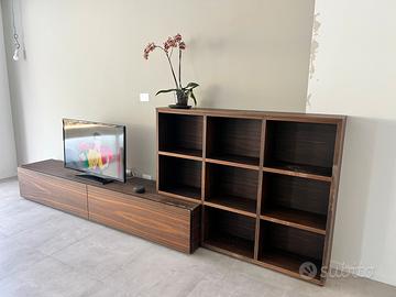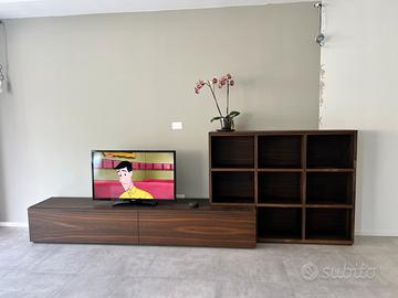 Mobile tv in rovere affumicato composto da: due vetrinette in vetro opaco bianche ( orizzontale a ribalta, verticale ad anta battente), scaffalatura a giorno, struttura orizzontale con un cassetto e una ribalta. Pagato 4500€ , svendo causa inutilizzo. Leggeri segni di usura sistemabili con normale olio per mobili. Dimensioni mobile in rovere: 340 x 45 x h40 cm ( scaffale h 118cm) Dimensioni vetrinette: 150 x 35 x h35