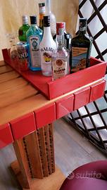 Vendo mobile bar fattura artigianale creato su misura con doppia funzione: Bar o tavolo. Basi in legno massiccio color miele finemente decorate con mosaico in vetro color Ambra e oro. Piano superiore, sempre in legno massiccio è ornato da graziose piastrelline rosse in argilla fatte a mano. Tutta la struttura è trattata(resistente all' acqua)per essere posizionata sia all'interno che all'esterno. Pezzo unico e introvabile, per la sua versatilità, è adatto sia per taverne o soggiorni che per gazebi o pompeiane.
