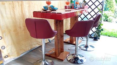 Vendo mobile bar fattura artigianale creato su misura con doppia funzione: Bar o tavolo. Basi in legno massiccio color miele finemente decorate con mosaico in vetro color Ambra e oro. Piano superiore, sempre in legno massiccio è ornato da graziose piastrelline rosse in argilla fatte a mano. Tutta la struttura è trattata(resistente all' acqua)per essere posizionata sia all'interno che all'esterno. Pezzo unico e introvabile, per la sua versatilità, è adatto sia per taverne o soggiorni che per gazebi o pompeiane.