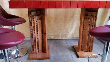 Vendo mobile bar fattura artigianale creato su misura con doppia funzione: Bar o tavolo. Basi in legno massiccio color miele finemente decorate con mosaico in vetro color Ambra e oro. Piano superiore, sempre in legno massiccio è ornato da graziose piastrelline rosse in argilla fatte a mano. Tutta la struttura è trattata(resistente all' acqua)per essere posizionata sia all'interno che all'esterno. Pezzo unico e introvabile, per la sua versatilità, è adatto sia per taverne o soggiorni che per gazebi o pompeiane.
