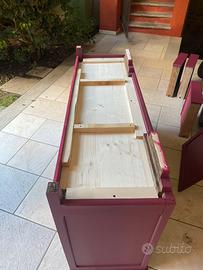 Rifatto tutti gli interni e il fondo, applicato carta da parati su ripiani e nell’interno dei cassetti.