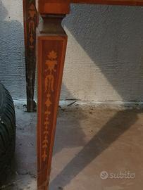 Il mobile presenta una raffinata decorazione a intarsio floreale in legno chiaro su fondo in noce. Dotato di tre cassetti e un'anta a ribalta. Le gambe troncopiramidali e le proporzioni eleganti ne fanno un arredo decorativo di gusto classico, ideale per ambienti tradizionali o d’epoca.