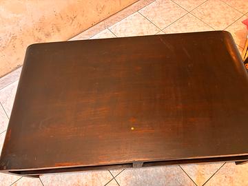 Il mobile di legno basso si trova appoggiato alla parete, con una forma compatta e orizzontale. È realizzato in legno resistente, dal colore caldo e naturale, con venature visibili che rendono la superficie unica. La parte superiore è ampia e liscia, ideale per appoggiare oggetti decorativi o di uso quotidiano. La sua altezza ridotta lo rende pratico e poco ingombrante, mentre il materiale in legno trasmette una sensazione di solidità, semplicità e accoglienza. presenta delle piccole imperfezioni eventualmente da aggiustare