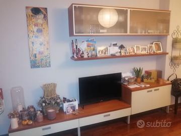 Vendo mobile soggiorno moderno. Misure parte bassa 3 metri, per chi ha problemi di spazio si può dividere il lato destro e appoggiare sopra ( 1 metro), parte alta con vetri + mensola, lunghezza 2 metri. Disponibile da fine marzo