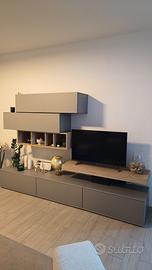 mobile moderno per salotto in grigio e inserto in legno chiaro con sportelli a basculante tenuto benissimo la lunghezza degli sportelli che sono alla base è di cm 270