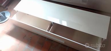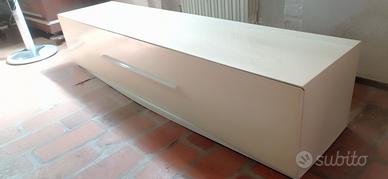 Mobile TV Basso / Madia Moderna Lucida – Beige Chiaro/Crema Descrizione In vendita mobile basso dal design moderno e minimalista, perfetto come mobile porta TV Il mobile è estremamente funzionale, dotato di un ampio cassettone a estrazione totale (che si apre rivelando due scomparti interni separati, come mostrato in foto), ideale per organizzare dispositivi multimediali, console, telecomandi, documenti o oggetti per la casa. La maniglia è sottile e cromata, in linea con lo stile moderno del mobile. Caratteristiche: Stile: Moderno, Contemporaneo, Minimalista. Materiale e Finitura: Laccato lucido di alta qualità. (Acquistato da Semeraro arredamenti) Colore: Beige chiaro / Crema (un colore neutro e facile da abbinare). Storage: 1 ampio cassetto frontale diviso in 2 scomparti. Stato: Il mobile è usato ma si presenta in ottime condizioni generali, con la superficie laccata ancora brillante. Dimensioni Esatte Lunghezza: 178 cm Larghezza (Profondità): 43 cm Altezza: 38 cm Le sue dimensioni lo rendono perfetto per TV anche di grandi dimensioni, mantenendo un profilo basso ed elegante. Informazioni per la Vendita Prezzo: 100€ Ritiro/trasporto: a cura e carico acquirente. Il tavolo si trova a Ferrara in centro storico.
