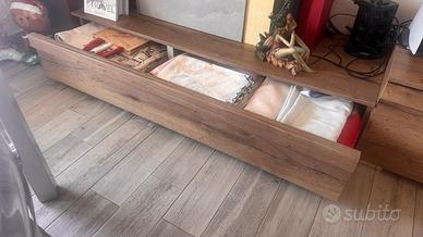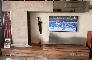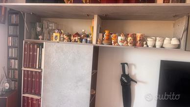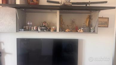 Il mobile si presenta in buone condizioni, tranne per una piccola scheggiatura sulla base. Le foto si riferiscono alla nostra configurazione, ma essendo moduli può essere montato a piacimento. E' composto da: - due cassettoni cm150x41 e cm150x36 compresi piedini - pensili cm120x35 (vetrina fumè) e cm180x35 - modulo libreria/sportello cm130x90 Ritiro a domicilio (zona Roma Pietralata - interno GRA), a carico dell'acquirente. Per maggiori informazioni, non esitate a contattarmi.