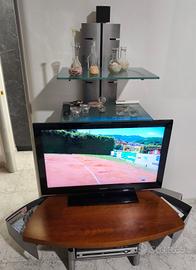 materiali: acciaio, legno massello ciliegio, con tasche portaoggetti basculanti lateralmente, mensole in cristallo di spessore, regolabili in altezza. Sistema posteriore verticale per occultare cavi. Nessun segno di usura, ottime condizioni.