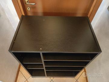 Mobile nero porta TV che può essere utilizzato anche come mobile contenitore o libreria a giorno.