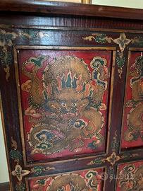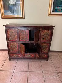 Splendido mobile orientale vintage in legno, caratterizzato da decorazioni dipinte a mano con motivi floreali e figure tradizionali su fondo rosso. Un pezzo unico che unisce funzionalità e fascino esotico, ideale come credenza, cassettiera o elemento d’arredo decorativo. In buone condizioni, con una bellissima patina del tempo che ne esalta l’autenticità.