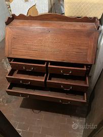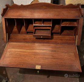 Scrivania/ribalta pachistana realizzata nella seconda metà del XX secolo in stile inglese, legno teak e intarsiata in ottone con disegni floreali. 5 cassetti esterni e uno piccolo interno; con propria chiave per apertura e chiusura scrivania. In ottimo stato. Mobile molto elegante.