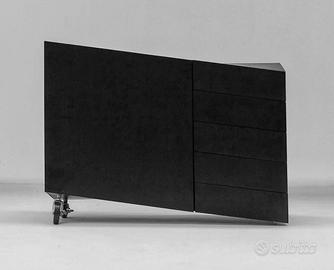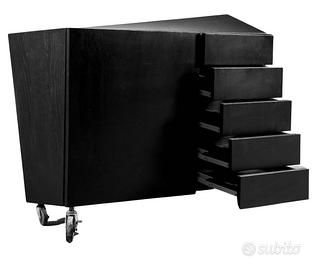 In vendita un raro esemplare del celebre mobile contenitore "Viva il Toro" (W il Toro), progettato da Paolo Pallucco & Mireille Rivier per Pallucco. Non si tratta di un semplice arredo, ma di una scultura funzionale, simbolo del design radicale italiano degli anni Ottanta. Viva il Toro reinterpreta la figura del toro – archetipo di forza e mito – trasformandola in un oggetto d’arredo provocatorio e iconico. Oggi fuori produzione, rappresenta una rarissima opportunità per collezionisti, gallerie e appassionati di design. Realizzato in legno impiallacciato rovere verniciato nero, è montato su ruote per facilitarne lo spostamento. Un lato presenta una porta che si apre su ripiani interni, l’altro lato è dotato di cassetti, unendo così una forte presenza scultorea alla funzionalità contenitiva. Non presenta evidenza del marchio, in linea con la filosofia progettuale dei designer. Scheda tecnica: Progetto: Paolo Pallucco & Mireille Rivier Produttore: Pallucco Tipologia: Mobile contenitore / Scultura Materiale: Legno impiallacciato rovere verniciato nero Dotazione: Porta con ripiani interni su un lato, cassetti sull’altro, ruote Dimensioni: L 116 x P 49 x H 89 cm Stato: Ottime condizioni Disponibilità: Unico esemplare disponibile