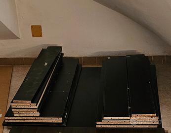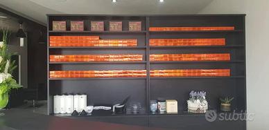 Parte inferiore in melamminico e composta da 2 mobili identici, entrambi con scaffali e double face della misura ciascuno di (l x h x p) 121x200x49